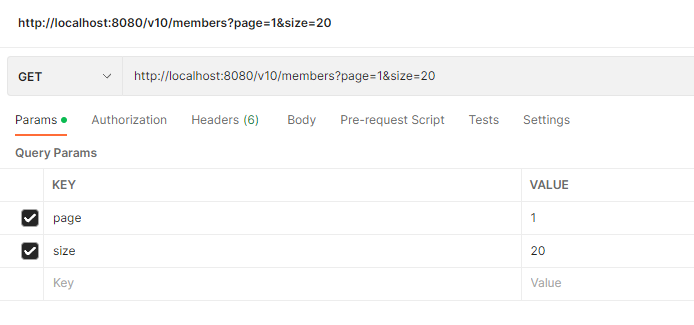 이후 Postman 을 사용해서 page 와 size 의 파라미터 값을 입력한 후, get 메서드를 실행하면 결과가 나온다