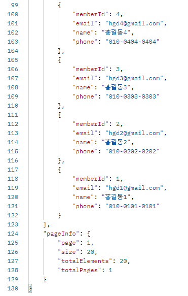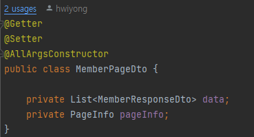 전체 멤버의 정보를 담고있는 data 와 pageInfo 를 필드로 받는 Dto 클래스 생성한다.