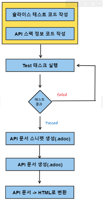 ⅰ. 일반적으로 Gradle의 빌드 태스크(task)중 하나인 test task를 실행 시켜서 API 문서 스니핏(snippet)을 일괄 생성 - 테스트 실행 결과가 “passed”이면 다음 작업을 진행하고, “failed”이면 문제를 해결하기 위해 테스트 케이스를 수정한 후, 다시 테스트를 진행해야 한다.